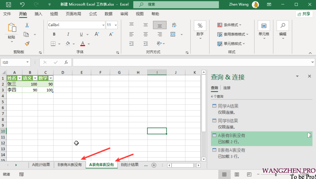 点击确定,看下结果,记过显示,张三 李四在左表中的数据与右表不同。重命名为A表有B表没有