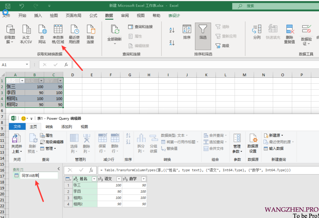 确定后,点击 数据 来自表格/区域,系统自动启动POWERQUERY编辑器,然后,将左侧查询的名称修改为同学A结果