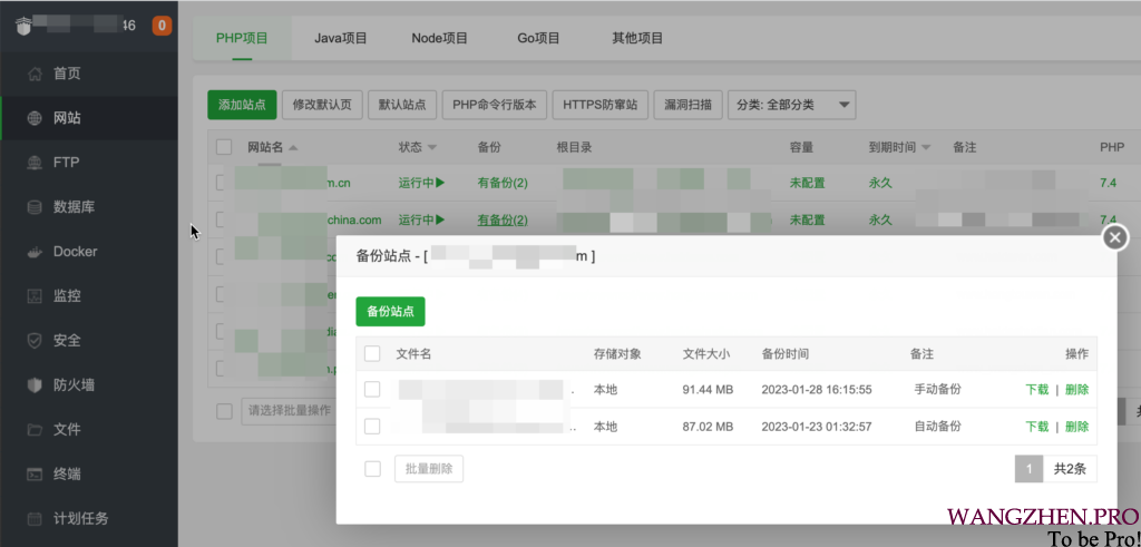 网站文件备份 进入网站-点击备份-备份站点 即可