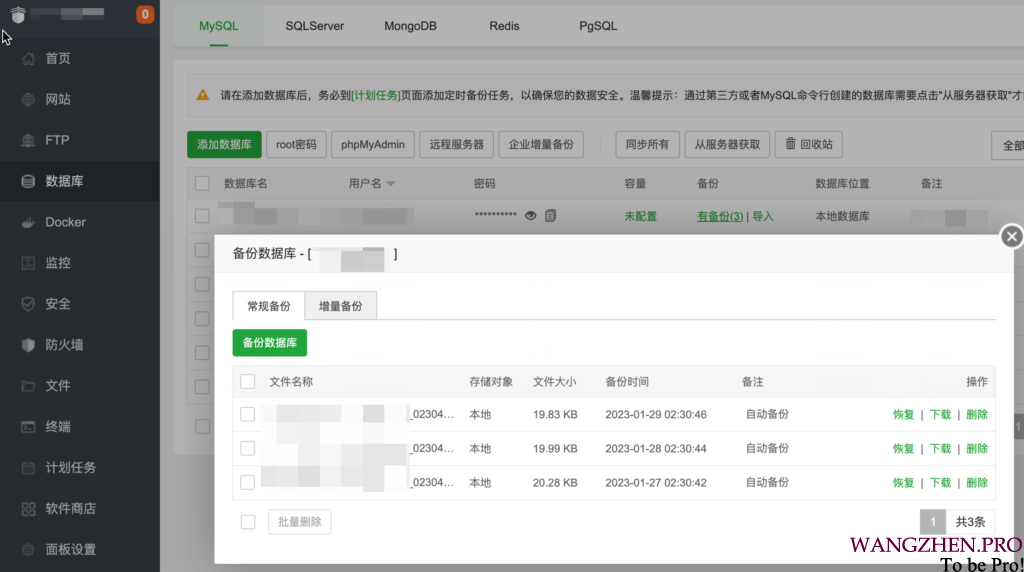如果使用宝塔管理系统,数据的备份是非常简单的: