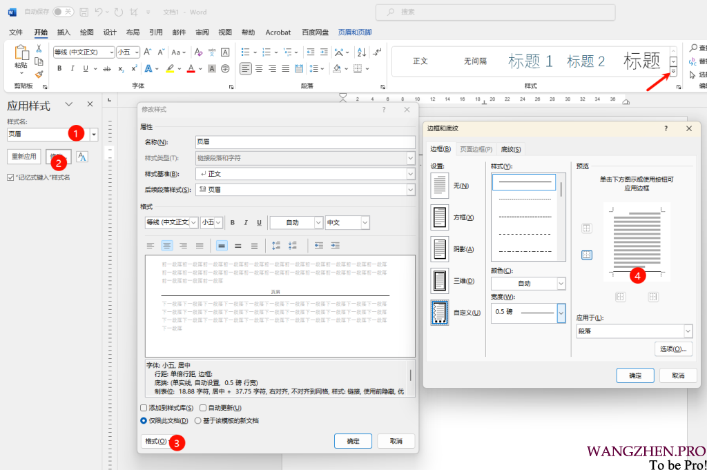 找到 页眉,选择修改,进入到样式修改的页面
